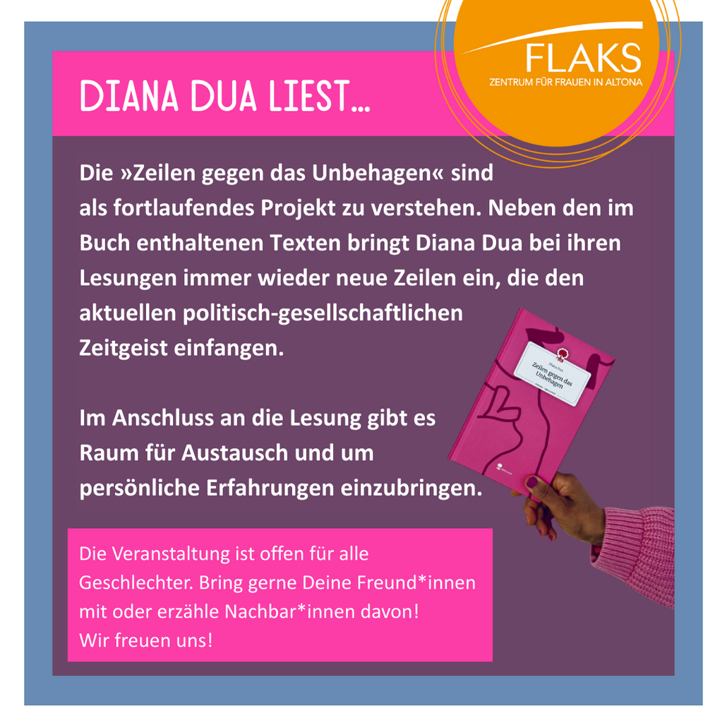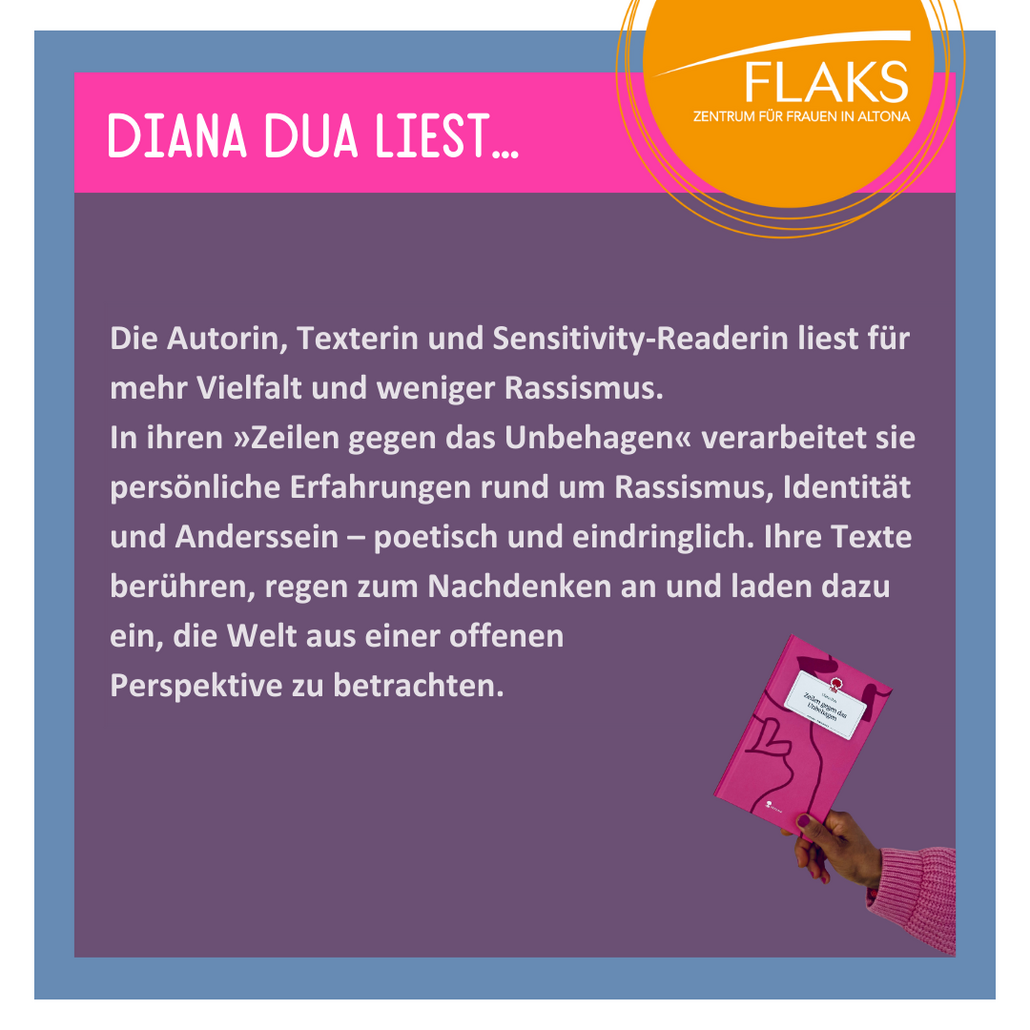 Wir freuen uns ausgesprochen, dass am 16.Oktober Diana Dua @schreibgold_hh für uns aus Ihrem Buch „Zeilen gegen das Unbehagen liest“