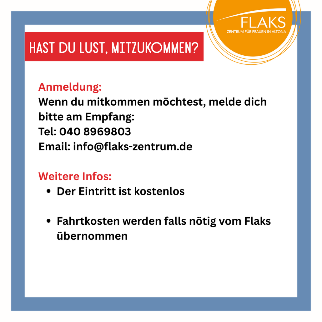 Anmeldung: Im FLAKS am Empfang. Persönlich oder per: