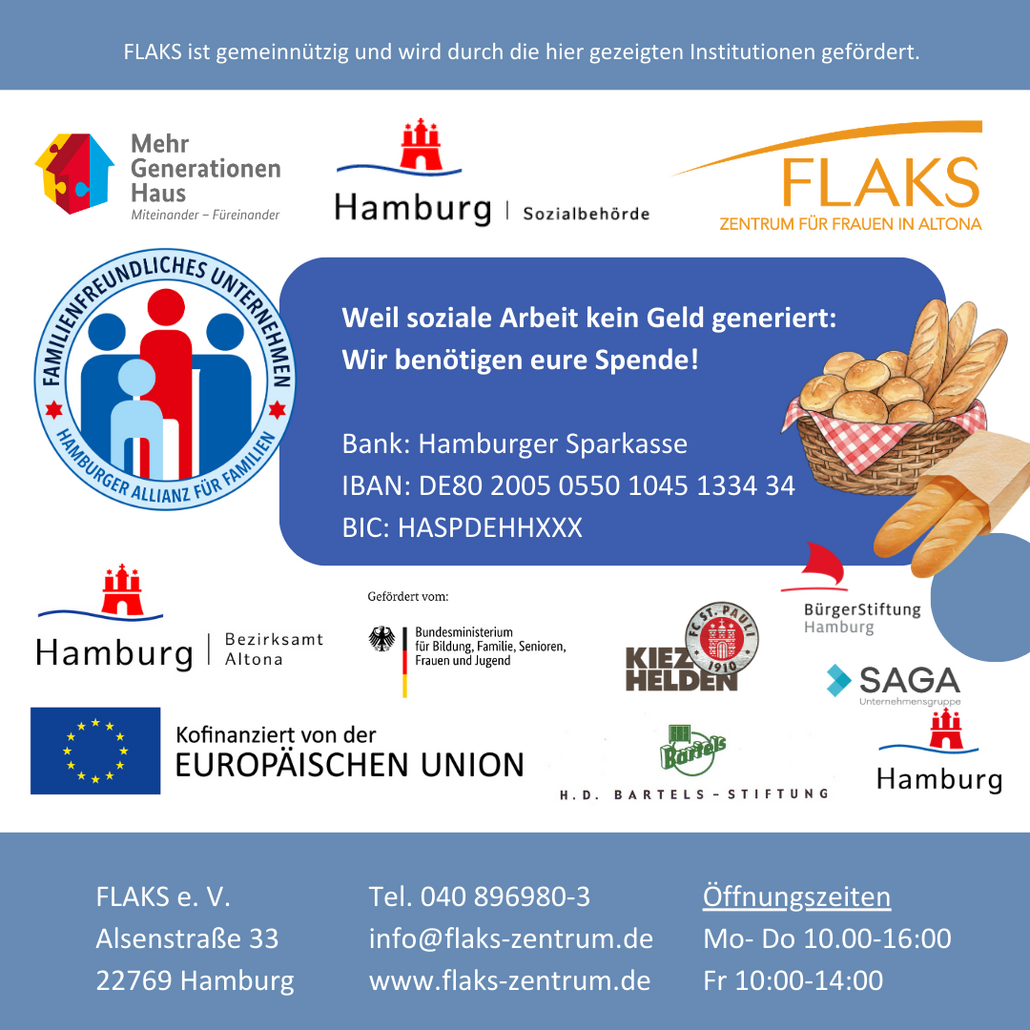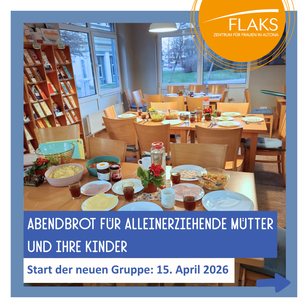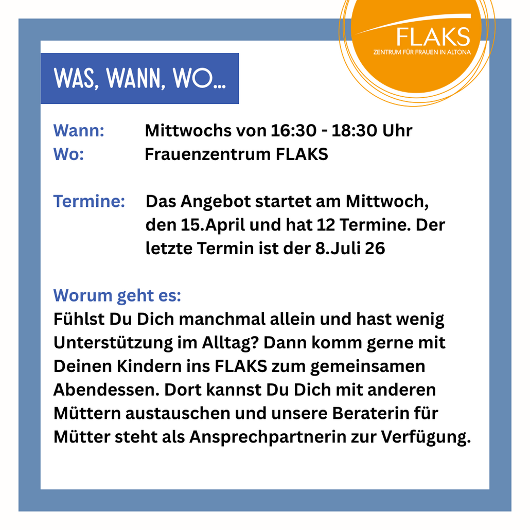 Fühlst Du Dich manchmal allein und hast wenig Unterstützung im Alltag? Dann komm gerne mit Deinen Kindern ins FLAKS zum gemeinsamen Abendessen. Dort kannst Du Dich mit anderen Müttern austauschen und unsere Beraterin für Mütter steht als Ansprechpartnerin zur Verfügung.